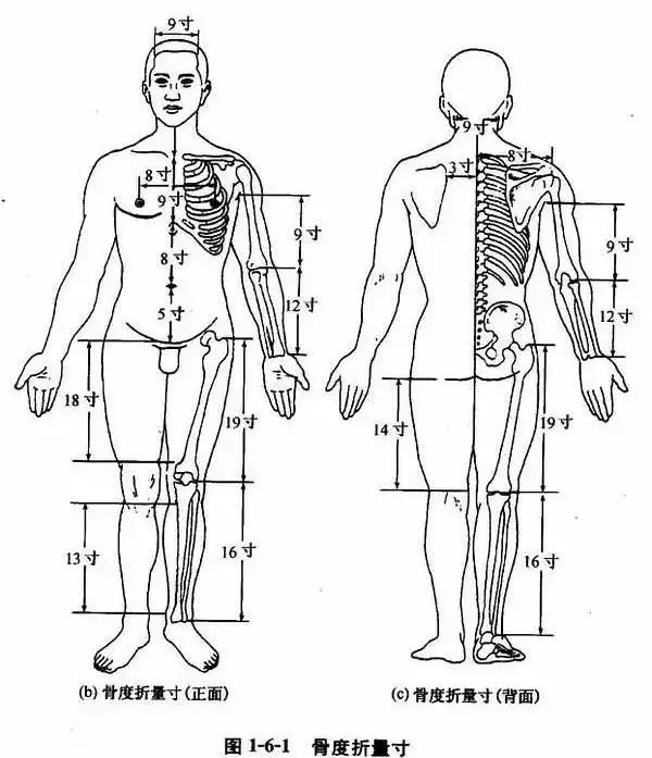 要重点说明的是,骨度分寸法里面提到的“寸”,并不是日常丈量的尺度单位,而是指“等分”。不论男女老幼,肥瘦高矮,每一等分就是一寸,按此标准作为量取腧穴的依据。
