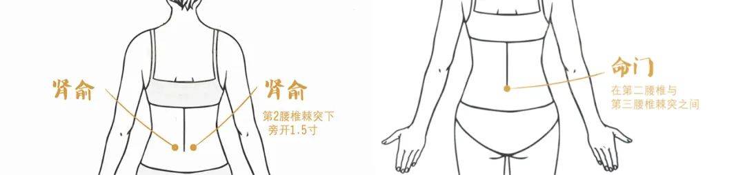 将两手搓热,捂于双侧肾俞穴(第2腰椎棘突下旁开1.5寸)上,再以命门穴(腰部,当后正中线上,第二腰椎棘突下凹陷处)和肾俞穴为中心,左右搓腰,也可上下搓。