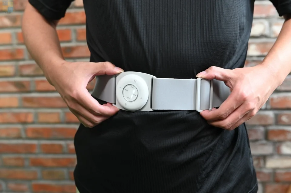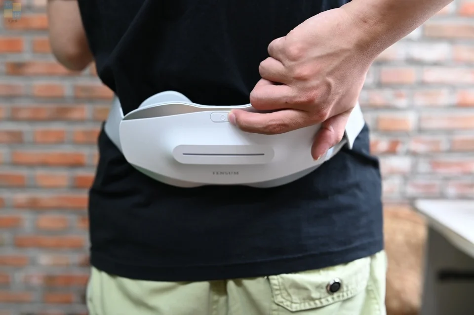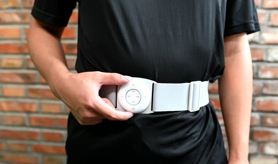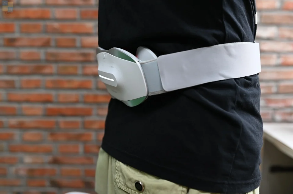这款按摩器的外侧有一个指示灯,可以用来提示当前的状态,并且它的开关键也位于外侧,我们可以在打开开关之后,再把按摩器围在腰上固定好。