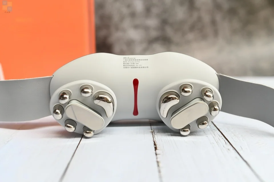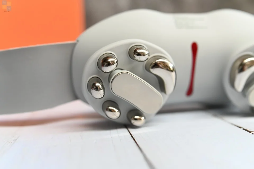 在十星小双鱼腰部按摩器用来按摩的这一面,正中间是个红外+远红外双重光疗的装置,左右两侧是对称分布的按摩头,包括了外侧的五个仿真人五指推揉按摩头,以及居中的TENS+EMS双脉冲按摩头,外加一个弧形的肾俞穴按摩头。其中TENS主要用来刺激感觉神经末梢,可以缓解疼痛,EMS主要用来刺激肌肉,两者结合可以起到缓解疼痛、锻炼肌肉的作用。