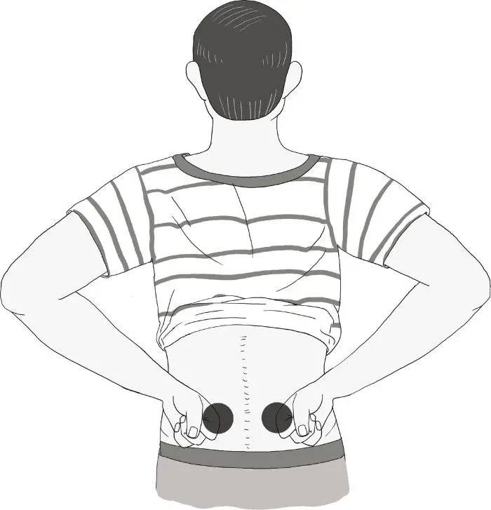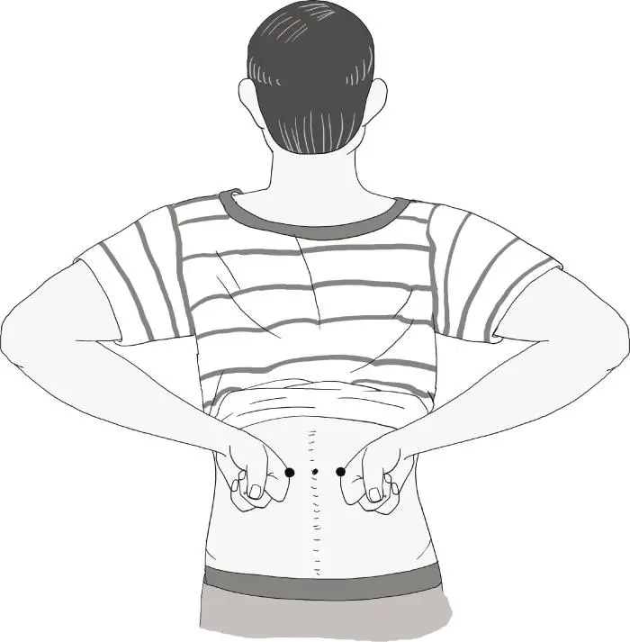 方法:将手心手背搓热,以食指掌指关节突起部放在两侧腰眼穴(腰眼穴在腰部第4腰椎棘突下旁开3~4寸处)上, 先顺时针方向压揉36下,再逆时针方向压揉36下。