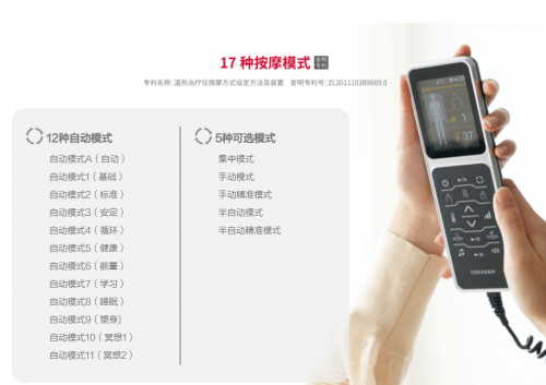 喜来健多功能温热理疗床CGM-V5拥有17种按摩模式。分别为12种自动模式和5种自定义模式,每一种模式根据穴位的不同,科学搭配了指压、按摩、热灸,按摩时间最长60分钟,最短38分钟,这17种按摩模式,均可通过遥控器进行调节,让使用者拥有舒适的健康体验。