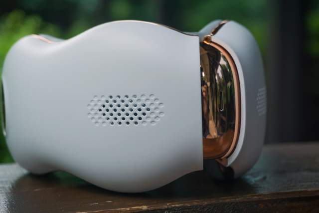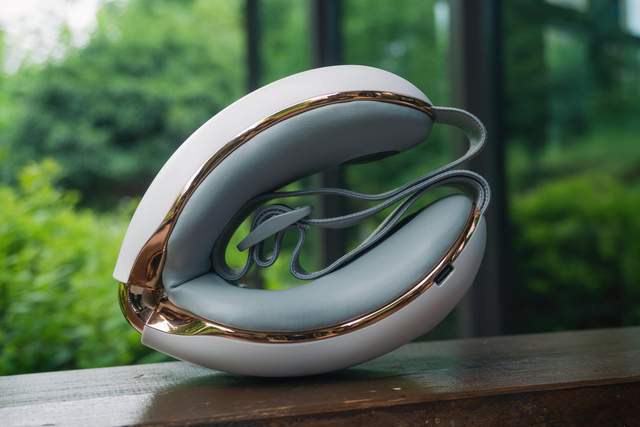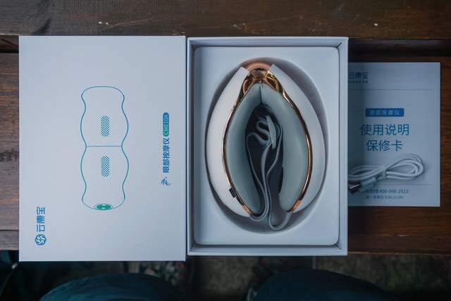 按摩仪是奶白+金的配色,未来科技感十足,正面颜值拉满,男女通用并不违和。