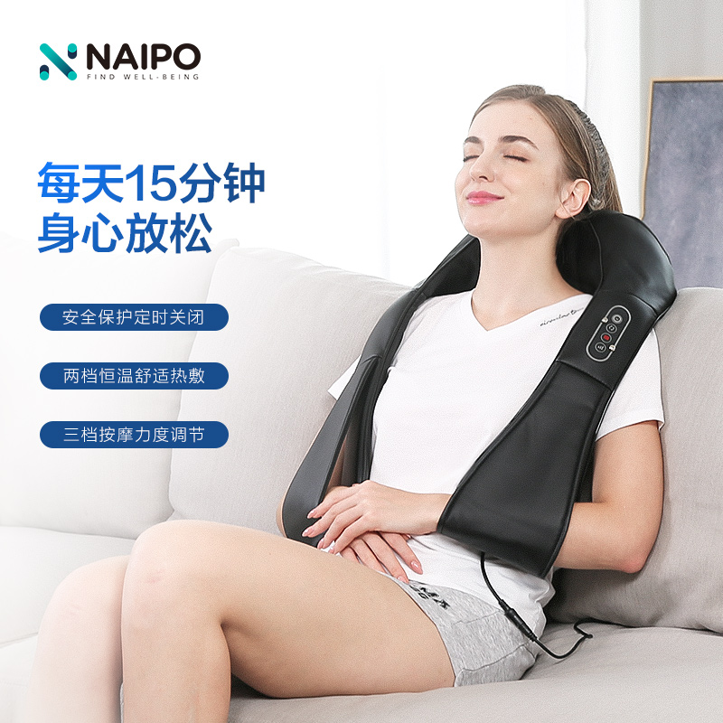 NAIPO 颈椎按摩器全面升级舒适柔软面料,婴儿般触感肌肤体验,并以三档速度、8个深度揉捏按摩头,通过旋转按摩和自动双向让你足不出户,轻享专业按摩,随时随地放轻松,8个深度揉捏按摩头,自动双向,旋转按摩。
