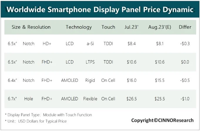 AMOLED方面:在旺季效应的带动下,面板需求持续增加,刚性及柔性AMOLED面板价格降幅均有所收敛,尤其柔性AMOLED面板,在经历了数月的降价后将在Q3’23趋于平稳,部分面板厂亦在寻求涨价。