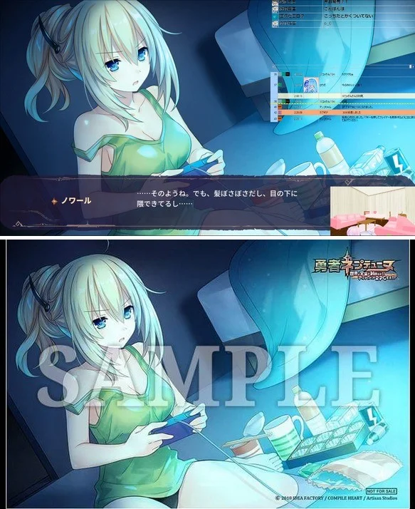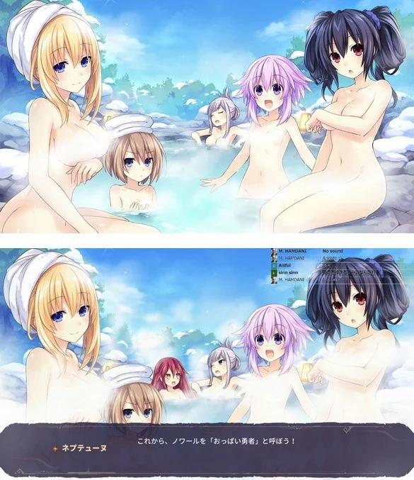在《勇者海王星》市场宣传的CG中有一张美少女们泡温泉的场面,实际到了PS4版游戏中出现了大量的雾气,可以通过下面的对比图看到效果。另外,有一张妹子在家中地板上玩游戏的CG也是一样,原本CG中是有露底的,到了PS4版,则是另一种情况了。另外,根据Switch玩家测试反馈,Switch版《勇者海王星》目前没有出现圣光、烟雾缭绕的情况。(图片来源于网络)