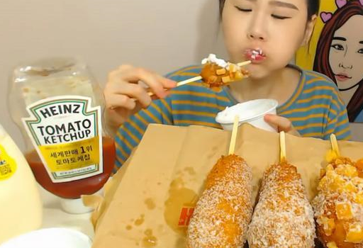看看这5个“棒槌香肠”,不知道有没有把你给馋到呢?来看一下她是怎么把这“棒槌香肠”给一口气吃完的吧,她先拿起一个大大的“棒槌香肠”,蘸足了奶油,放到嘴巴里,一口就咬下去大半个,把人馋得呀!