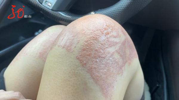 虽然事情已经过去几天时间,但记者在郑悠涵双腿的膝盖部位依旧能够看见一片红肿,皮肤也像被烫过一样有褶皱。