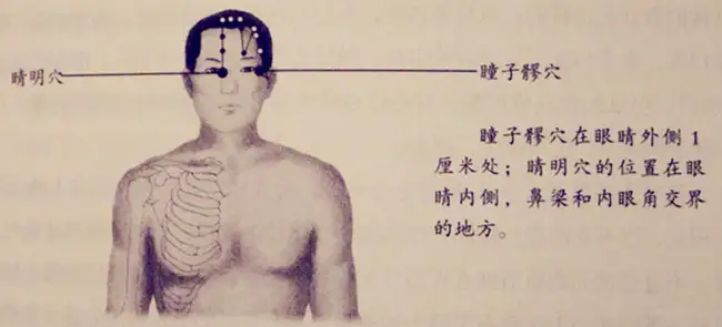 操作方法:两指的大拇指指腹夹住鼻根按睛明穴,垂直的往眼睛深部按,按一下松一下,连续做四个八拍。再用两拇指指背侧按摩双侧攒竹穴每次2分钟,早晚各一次,常年坚持。