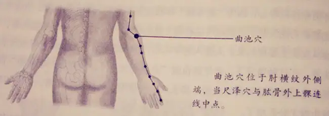 曲池穴位于肘横纹外侧端,屈肘,当尺泽与肱骨外上踝连线的中点。