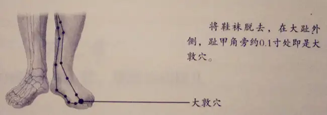 大敦穴在足大趾外侧趾甲角旁约0.1寸处即是。
