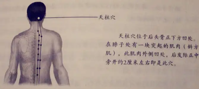 天柱穴位于后脑骨正下方凹处。在脖子处有一块突起的肌肉(斜方肌)此肌肉外侧凹处,后发际正中旁开约2厘米左右即是。