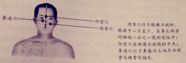 迎香穴位于眼睛正视时,眼珠中心点直下,在鼻孔两旁约拇指二分之一宽的笑纹中; 印堂穴在两眉头连线的中点;鼻通穴位于鼻唇沟上端尽头软骨与硬骨交接处。