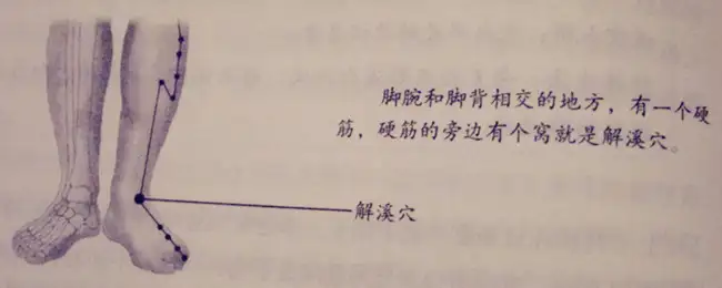脚腕和脚陂相交的地方,有一个硬筋,硬筋的旁边有个窝就是解溪穴。