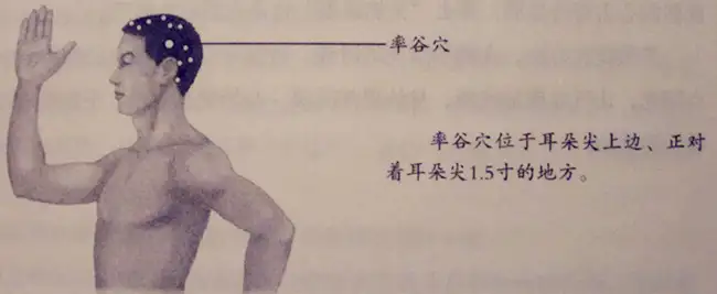 率谷穴位于耳尖上边、正对着耳朵尖1.5寸的地方。