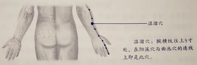温溜穴位于腕横纹往上5寸处,在阳溪穴与曲池穴的连线上即是此穴。