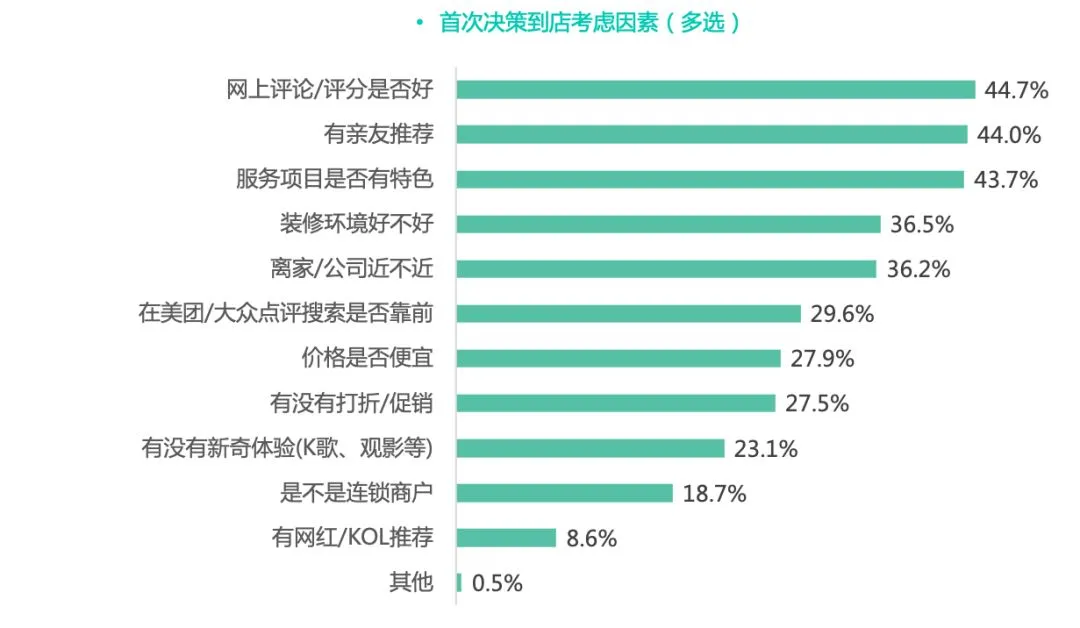 互联网化:互联网已渗透到消费者信息获取、决策评价、预约/消费等各个环节。报告显示,近60%消费者通过美团/大众点评查询商户信息、进行线上消费,首次消费时网上评论/评分是第一参考因素;相比线下地推拓客,消费者更乐于参与网络拼团、线上优惠等促销活动。