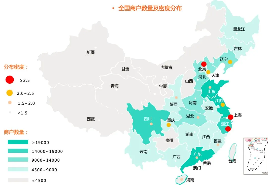 具体到区域分布来看,商户主要集中在广东、山东、江苏等东南部地区,其中以成都、北京、上海、重庆这4个城市数量最多,组成足疗/按摩界的“一线城市”,青岛、长沙则是名副其实的增长“潜力股”。而在业务类型和价格档次分布上,有着广泛受众基础的足浴店仍占主流,整体占比达45%,客单价近一年呈小幅上升趋势,但仍集中在中低档区间,这也是行业整体利润率不高的一大原因。