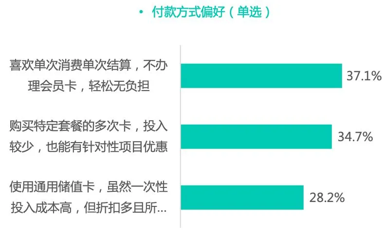 智慧消费:消费者愿意投入也更加注重品质,不盲目跟风。报告显示,70后消费金额最高、80后消费频次最高,90/00后消费潜力最大;而过硬的技术、划算的套餐才能让消费者更多买单;付费方式上,消费者偏爱更灵活的单次结算、特定次卡套餐等,避免无效投入。