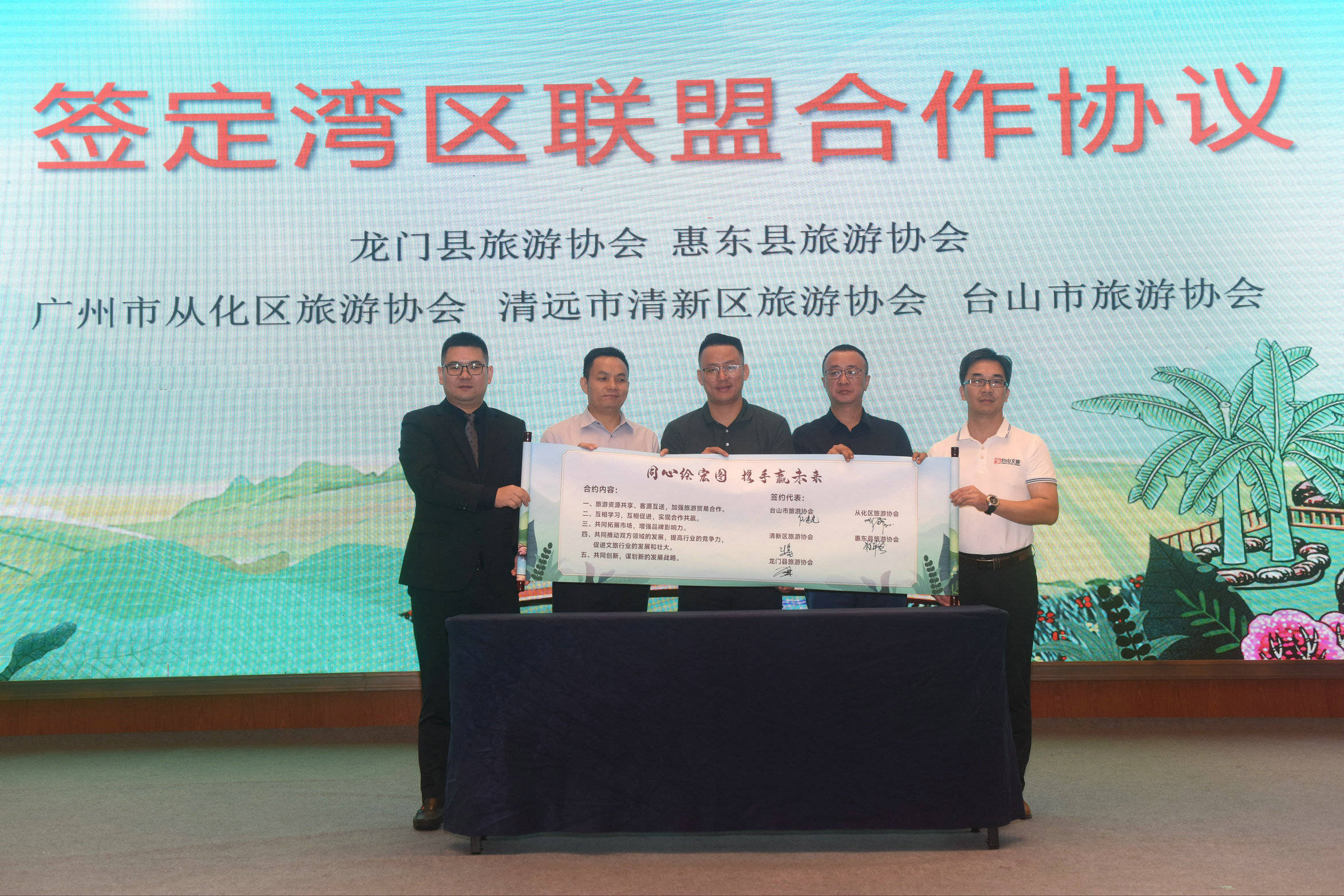 龙门县、台山市、从化区、清新区、惠东县的旅游协会签订湾区联盟合作协议。