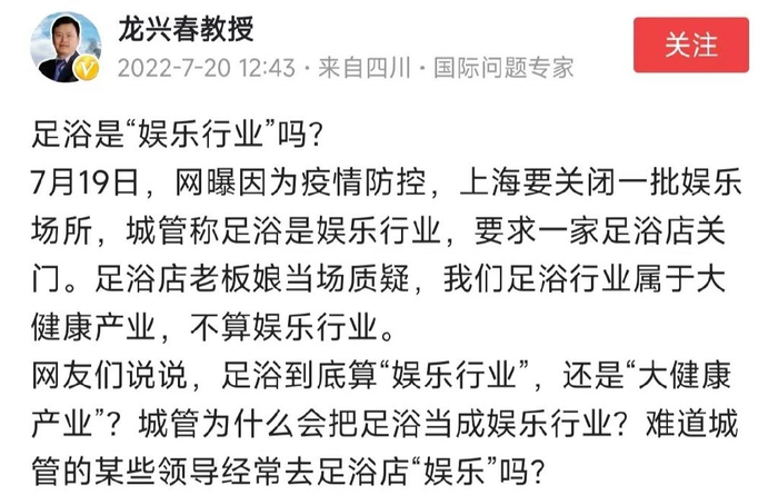 对于这个问题,拥有近百万粉丝的龙兴春教授并没有直接表达观点,但是可能借用网友的观点表达了自己的看法。其中有一句是“难道城管的某些领导经常去足浴店‘娱乐’吗?”。龙兴春教授非常隐晦地表示,足浴行业并不算娱乐行业。