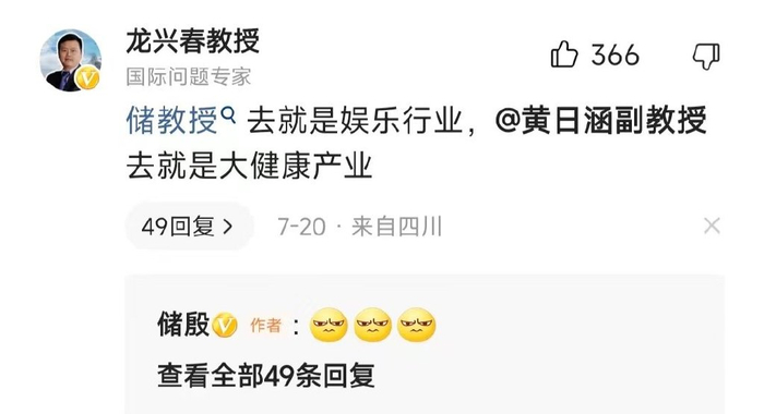 龙兴春教授评论了储殷教授,他调侃道:如果是储殷教授去就是娱乐行业,如果是黄日涵教授去就是大健康产业。