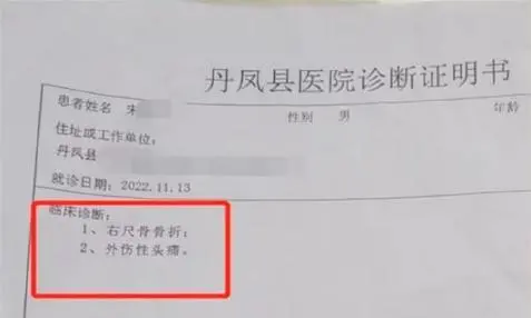 宋某报警后当晚去医院检查,医生让先回家观察。宋某第二天右臂痛疼难忍,自行前往丹凤县医院检查,经诊断右尺骨骨折,外伤性头疼。