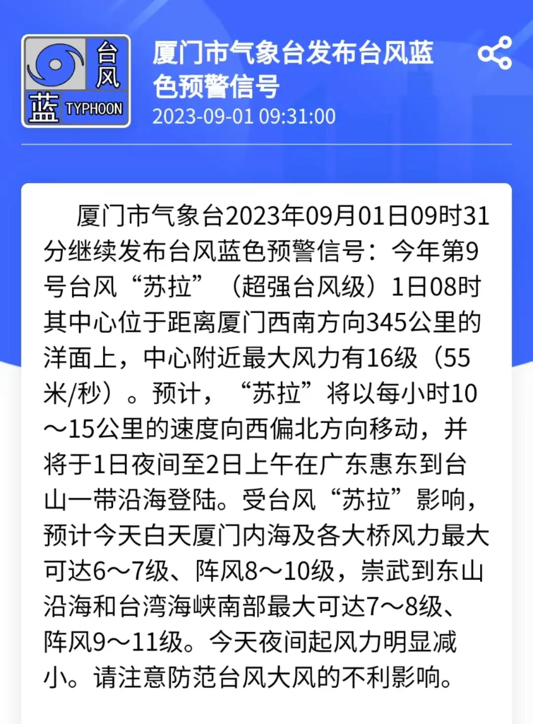 厦门市气象台9月1日9时31分