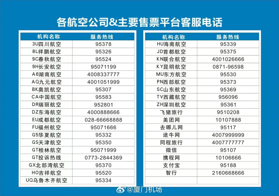 因各航司航班运行计划实时变动,请广大旅客前往机场前务必先行通过所乘航空公司官方热线、官网、APP,或拨打厦门机场客服专线0592-96363了解航班动态,如遇航班延误或取消,请不要急于前往机场等待。