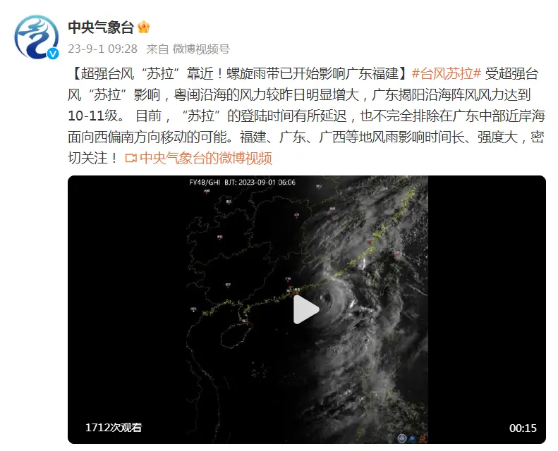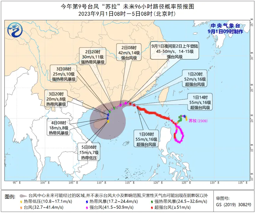 预计,“苏拉”将以每小时10-15公里的速度向西偏北转偏西方向移动,强度变化不大,将于9月1日夜间到2日上午在广东惠东到台山一带沿海登陆(强台风级或超强台风级,45-52米/秒,14-16级) ,也不完全排除在广东中部近岸海面向西偏南方向移动的可能 。
