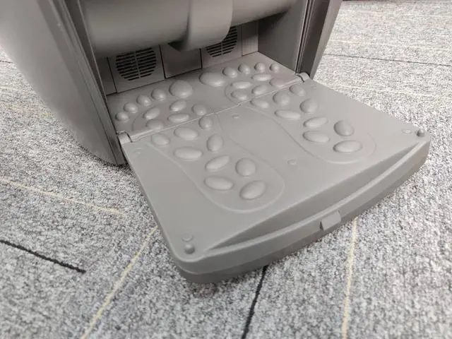 足浴桶下方是烘干舱,按下按键打开舱门。仓内可以看到是涡轮式设计,开启功能时此处有热风吹出,声音和电吹风差不多,可以接受,功能比较实用,泡完脚后不用再擦脚了。