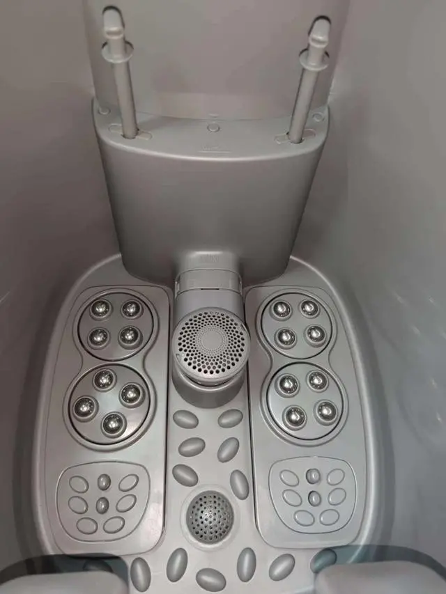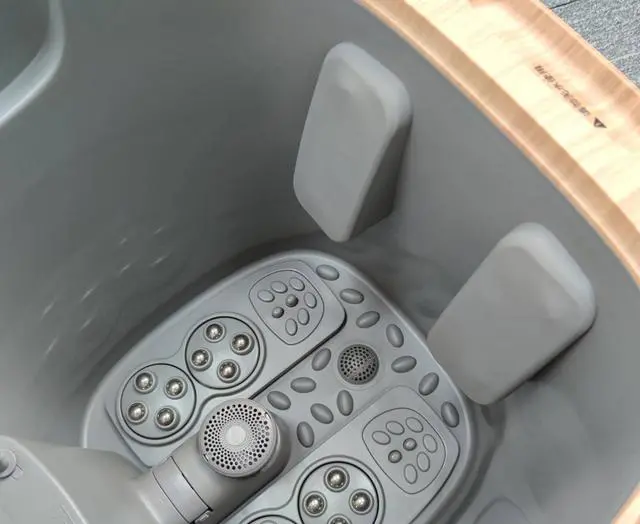 桶壁内贴有小腿按摩组件,看产品介绍以及触摸感受,是比较柔软的亲肤硅胶,硅胶下面有按摩头,高低错落,旋转工作,以还原人手揉捏按摩。12种按摩方式,经常按摩,有效缓解小腿肌肉酸痛。