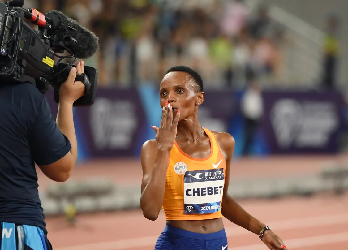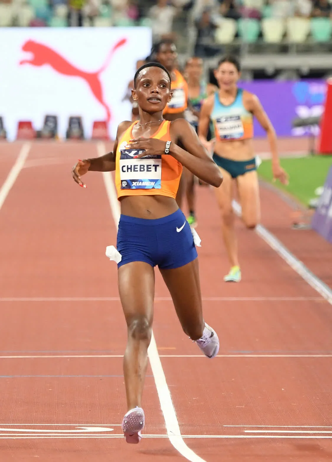 9月2日,肯尼亚选手切贝特(前)在女子3000米决赛中冲线。最终,她以8分24秒05的成绩获得冠军。新华社记者 林善传 摄