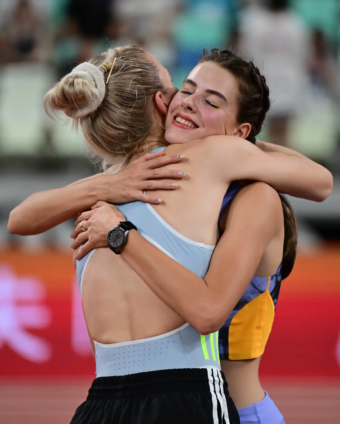 9月2日,乌克兰选手马胡齐克(右)在女子跳高决赛后庆祝。最终,她以2米02的成绩获得冠军。新华社记者 魏培全 摄