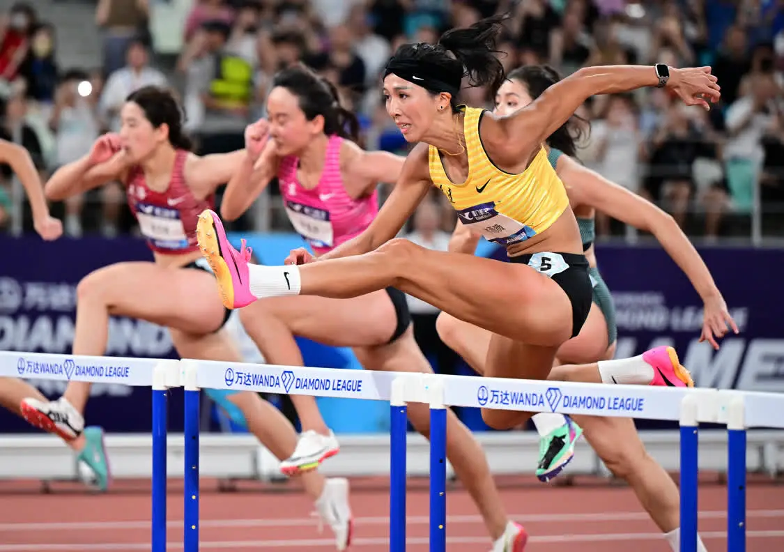 9月2日,中国选手林雨薇(前)在垫场赛女子100米栏比赛中。最终,她以13秒00的成绩获得冠军。新华社记者 魏培全 摄