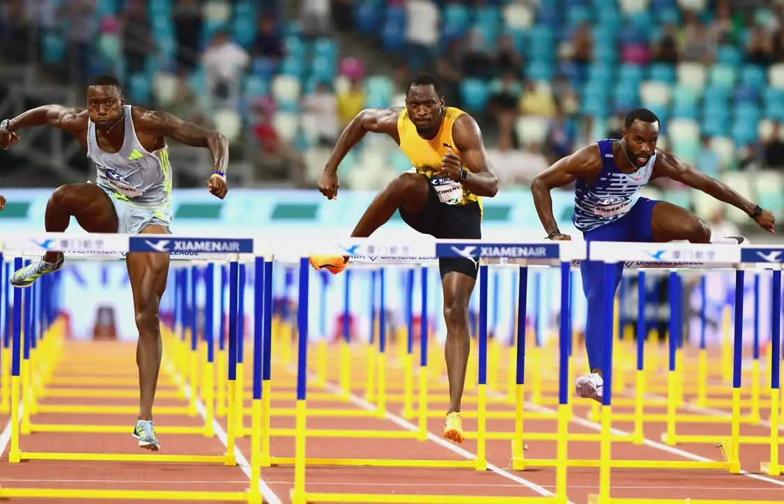9月2日,牙买加选手帕切门特(中)在男子110米栏决赛中。最终,他以12秒96的成绩获得冠军。新华社记者 魏培全 摄