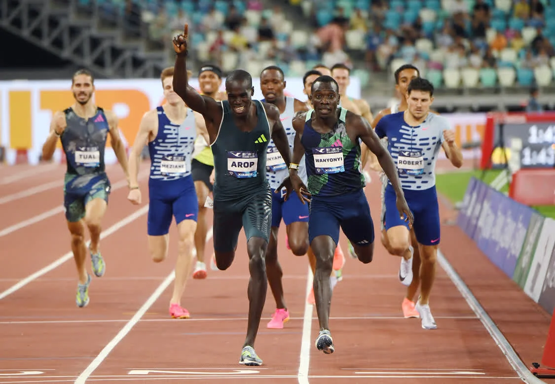 9月2日,肯尼亚选手瓦尼奥尼(前右)在男子800米决赛中冲线。最终,他以1分43秒20的成绩获得冠军。新华社记者 林善传 摄