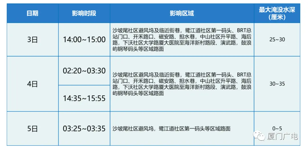 4、厦大至第一码头、鼓浪屿钢琴码头等沿海地势低洼区可能出现海水漫堤或倒灌 (具体见下表),请提前做好防淹防倒灌准备。