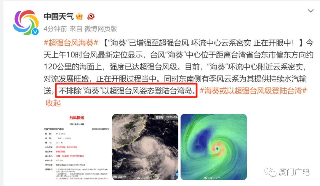 @中国天气:目前,“海葵”环流中心附近云系密实,对流发展旺盛,正在开眼过程当中。同时东南侧有季风云系为其提供持续水汽输送,不排除“海葵”以超强台风姿态登陆台湾岛。
