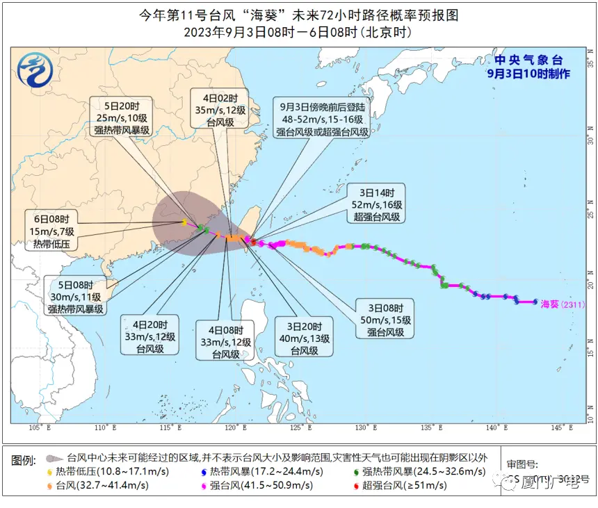 3日夜间~5日上午台湾海峡南部将有5.0~8.0 米的巨到狂浪 ,厦门沿海将有2.5~3.5米的大浪,近岸海浪预警级别为黄色。5日中午起海浪开始减小。具体预报如下表: