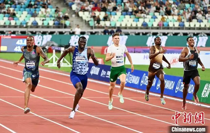 美国名将科尔曼(左二)以9秒83平今年世界最好成绩夺得百米飞人大战冠军。中新网记者王东明摄