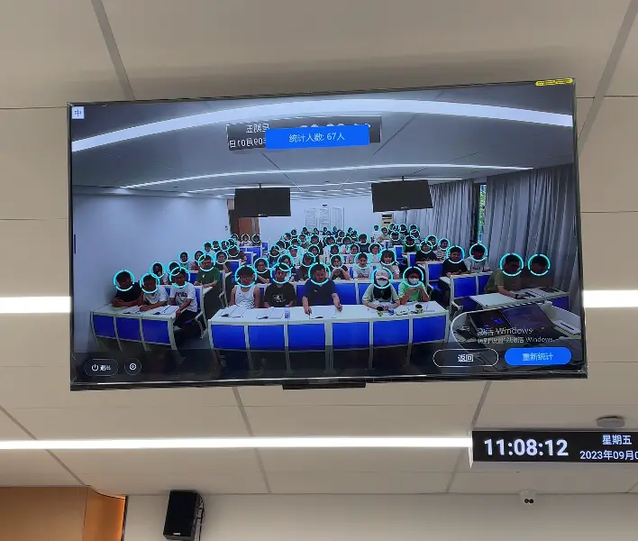 视频中,教室的电子屏把在场学生的人脸照在大屏幕上,很快,每个学生的人脸都被一个圆框识别,并在屏幕上方显示:统计人数41人。