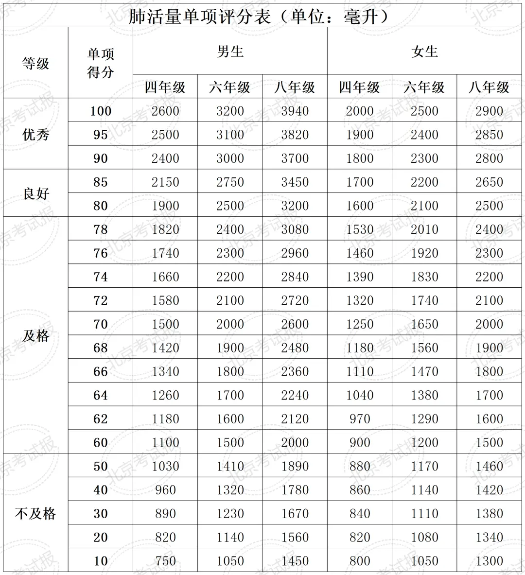评分标准依据《国家学生体质健康标准(2014年修订)》确定,该标准由教育部确定、全国大中小学统一适用。