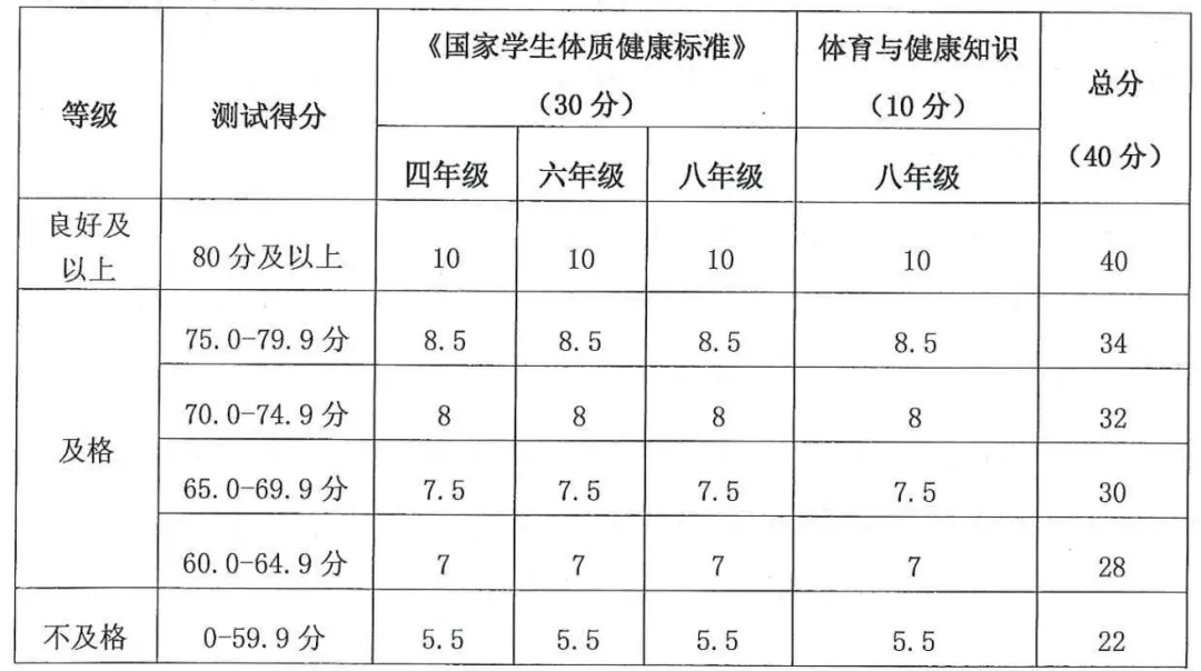 根据《国家学生体质健康标准(2014 年修订)》进行考核,考核时间为四、六、八年级第一学期,每次考核分值10分,共30分。体育与健康知识,10分,考核时间为八年级第二学期。