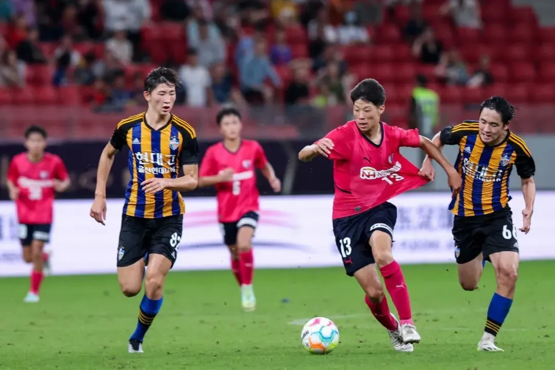 在“白玉碗”4000余名观众的注视下,韩国蔚山现代队与日本大阪樱花队联手献上了一场世界U16青少年足球顶尖水平的较量。