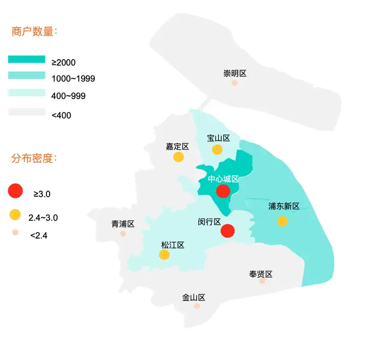 聚焦到上海这个城市,可以发现上海中心城区商业资源丰富、人口密集,足疗/按摩商户数量和分布密度也最高,其中长宁区分布密度最高。