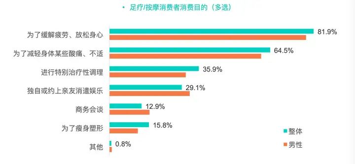 调查显示,消费者选择足疗/按摩主要是为了缓解疲劳、放松身心;其次就是为了消遣娱乐,另外有12.9%消费者是为了商务谈判。