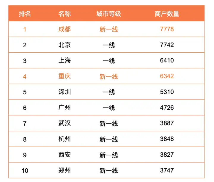 具体到各城市来看,商户数量排名前10的城市均属于一线、新一线城市,这些区域经济发达、人口密集,消费能力也更强。