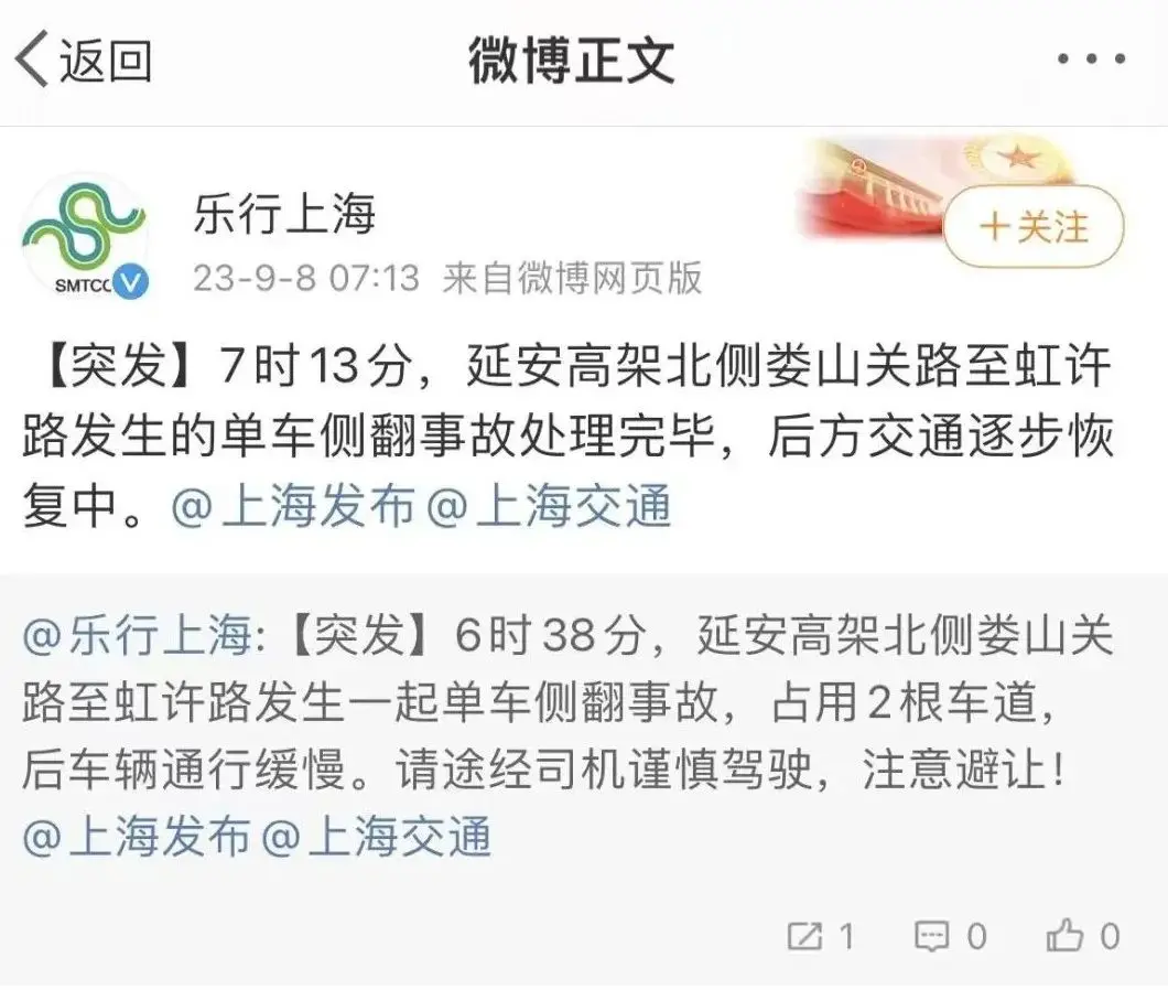 据上海市交通委交通指挥中心官方微博“乐行上海”消息,今天清晨6时38分,上海延安高架北侧娄山关路至虹许路发生一起单车侧翻事故,占用2根车道,后车辆通行缓慢。7时13分,单车侧翻事故处理完毕。