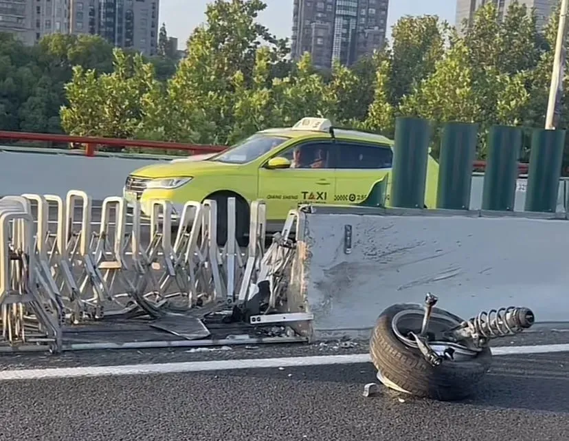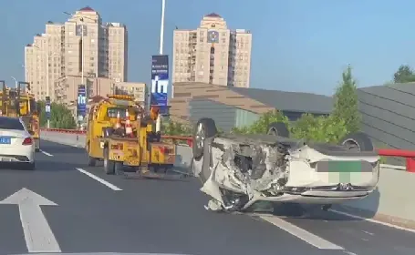 据了解,当时一辆白色轿车行驶至延安高架娄山关路至虹许路路段时,车辆突然撞击高架中央的设施,随后翻车。据目击市民介绍,轿车左前轮掉落,车损较为严重,车辆四轮朝天,翻在一号和二号车道上,车上人员下车站在一号车道边。